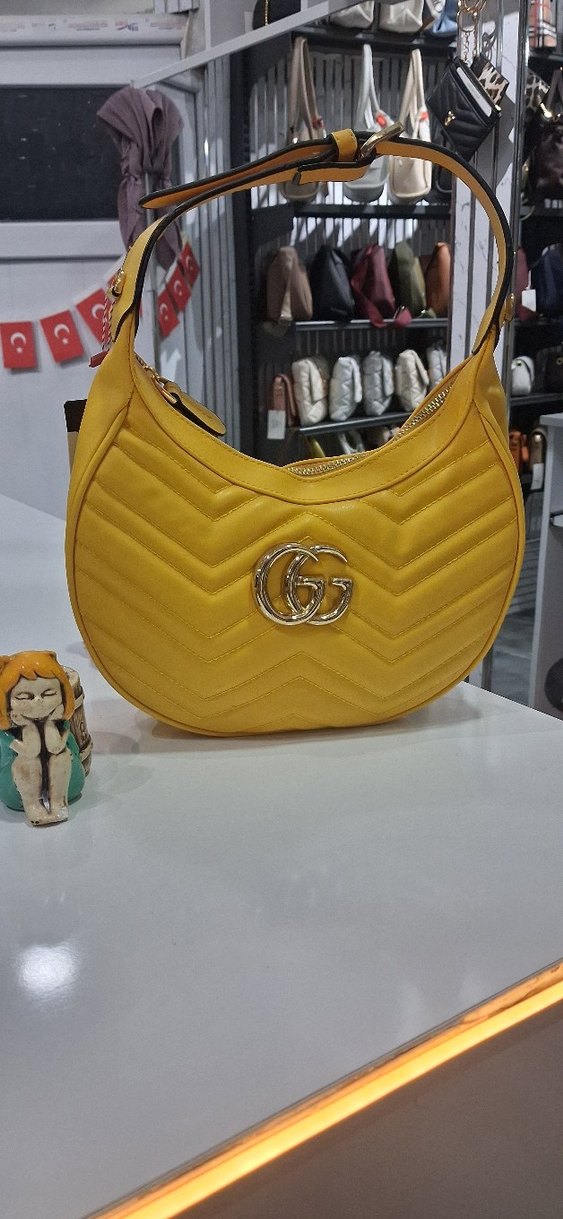 Parlak sarı deri kadın omuz çantası, tokalı kayış ve baskılı desene sahip. Klasik ve street wear tarzı, günlük kullanıma uygun.