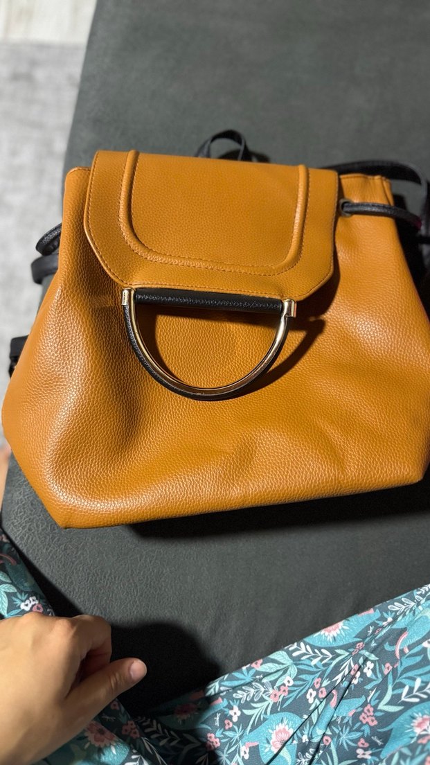 Sarı deri sırt çantası, tokalı kapak ve minimalist, çağdaş tasarıma sahip, trend günlük kullanım için uygun.