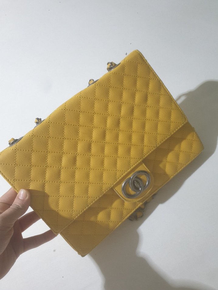 Sarı deri çanta, kareli desene ve tokalı kapama detayına sahiptir. Modern klasik tarzı Paris şıklığıyla buluşturur, günlük kullanıma uygundur.