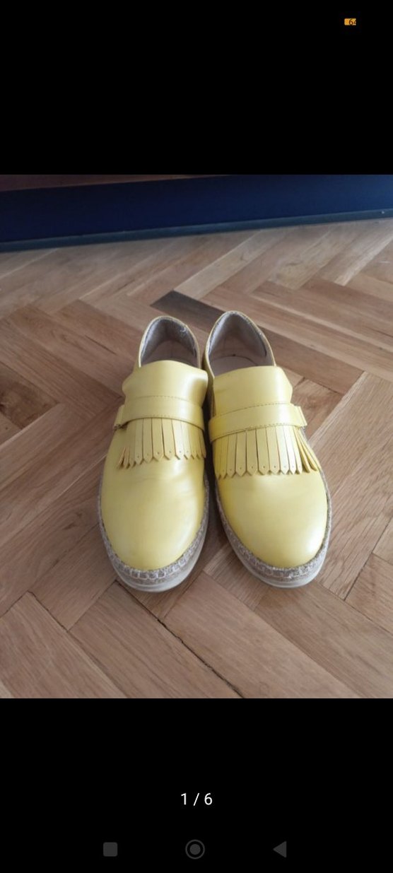 Sarı deri loafer, kama topuklu ve püskül detaylı, minimalist ve bohem tarzda günlük kullanım için uygundur.