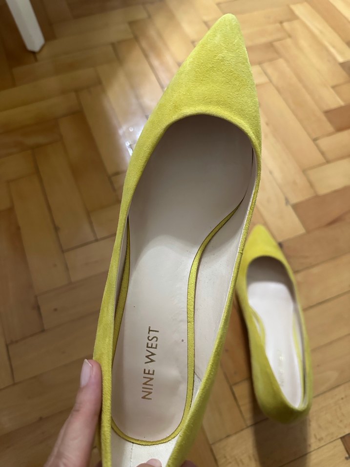 Nine West markalı sarı süet kadın dolgu topuk stiletto. Minimalist, desensiz tasarım günlük kullanım için zahmetsiz şıklık sunar.