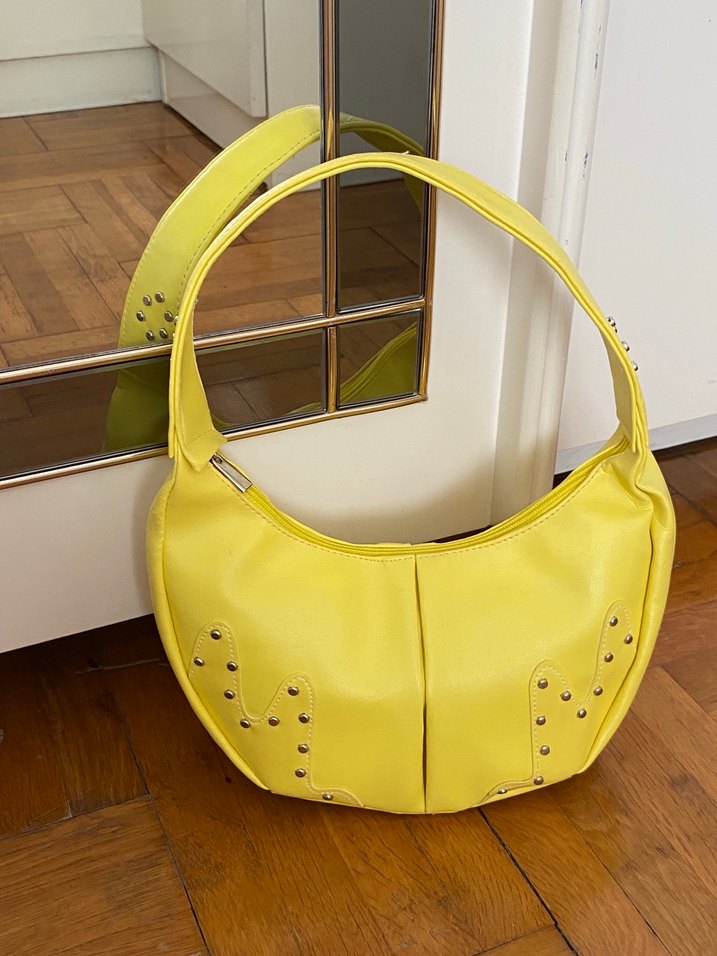 Parlak sarı deri, tokalı detaylara sahip kadın çanta. Minimalist ve çağdaş tarzda, hafif leopar desenli, günlük cesur kullanım için uygundur.