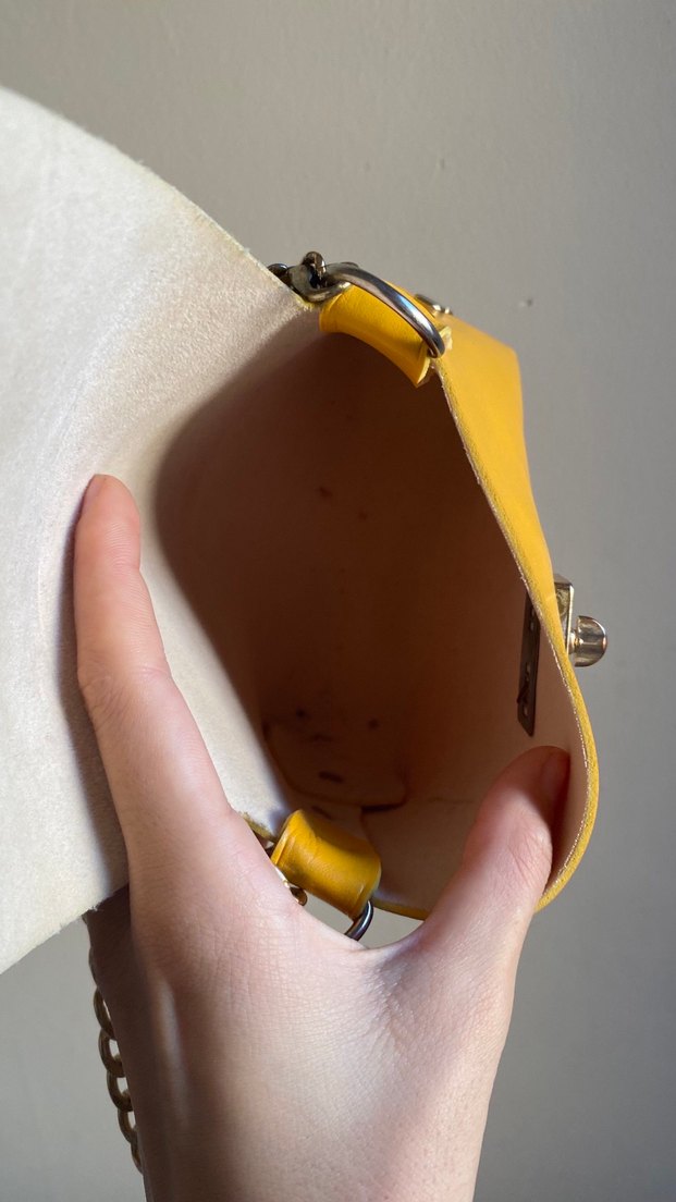 Sarı deri çanta, parlak yüzey ve tokalı kapanışa sahiptir. Minimalist, çağdaş tarzıyla günlük kullanıma uygundur.