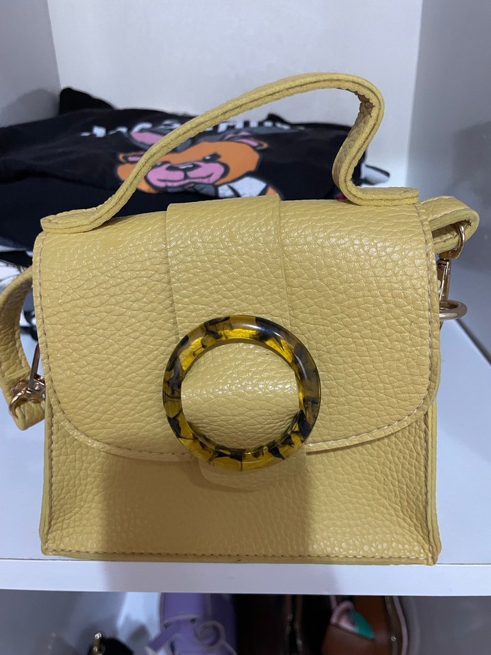 Sarı deri, tokalı ve yılan derisi desenli kadın çantası, trend sokak modasına uygundur.