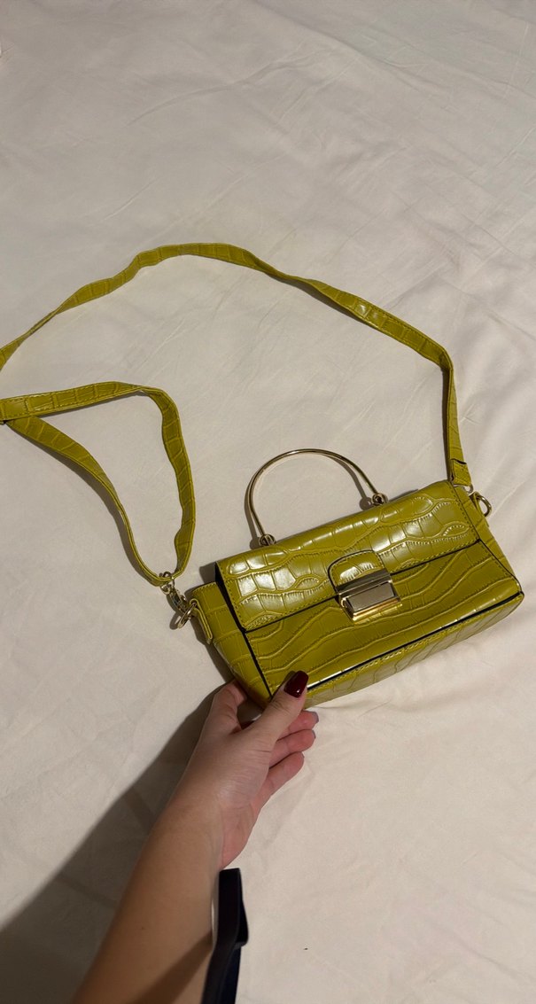 Parlak yılan desenli sarı deri çanta, tokalı kapama ve çıkarılabilir askı ile sokak stiline uygun.