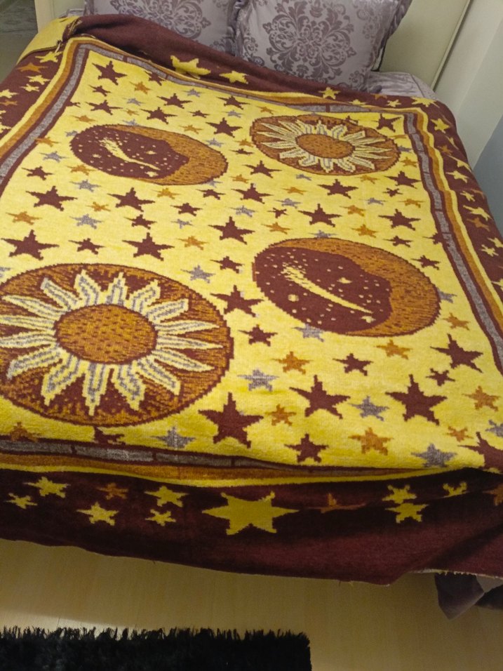 Koyu sarı renkte, yıldızlar ve dairesel desenler içeren desenli battaniyedir. Her yatağa sıcaklık ve dekoratif bir dokunuş katar. uçlarında sökülmeler mevcut ona göre ama kullanıma engel değil dokuma gibi kalın yumuşacık