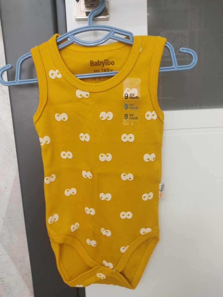Sarı renkli, renkli baskılı desene sahip, çıtçıtlı kapanışlı ve yumuşak sentetik kumaştan üretilmiş kolsuz bebek erkek body.