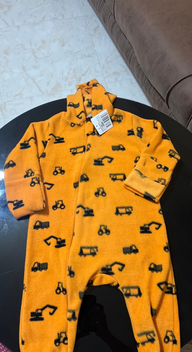 Sarı renkli, baskılı sokak stili bebek tulumu, yumuşak ve sıcak kumaştan üretilmiştir. 18 aylık 86 cm’dir
