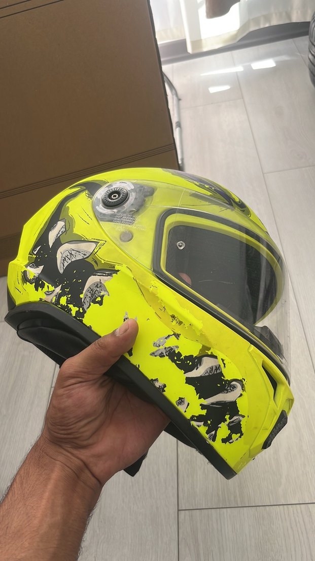 Sarı renkli, baskılı desenli ve tokalı kapamalı plastik biker motosiklet kaskı. Grunge punk tarzında, rock punk havası taşıyor. ️