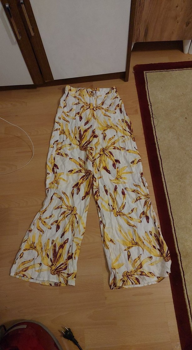 38 beden ama ×s ve s beden uyumlu Sarı desenli, bol kesim, uzun boy kadın kumaş pantolon. Pileli detaylı, bohem tarzda günlük kullanıma uygun.