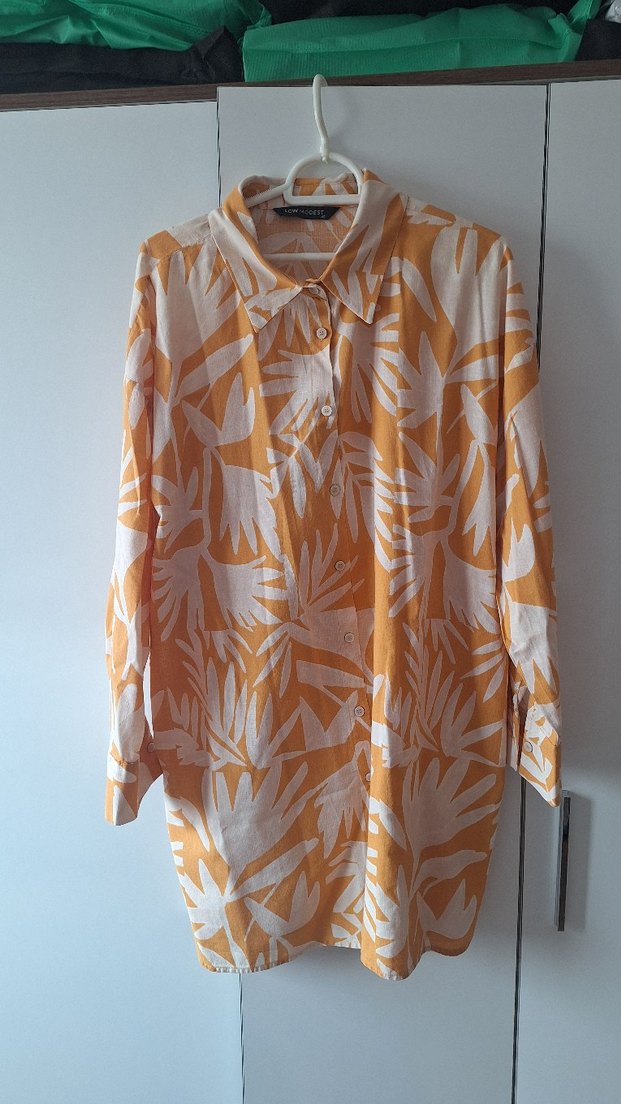 Sarı keten kumaştan, uzun kollu, bol kesim, yakalı ve desenli bohem tarzı gömlek, günlük kullanım için uygun.küçük geldiği için satıyorum