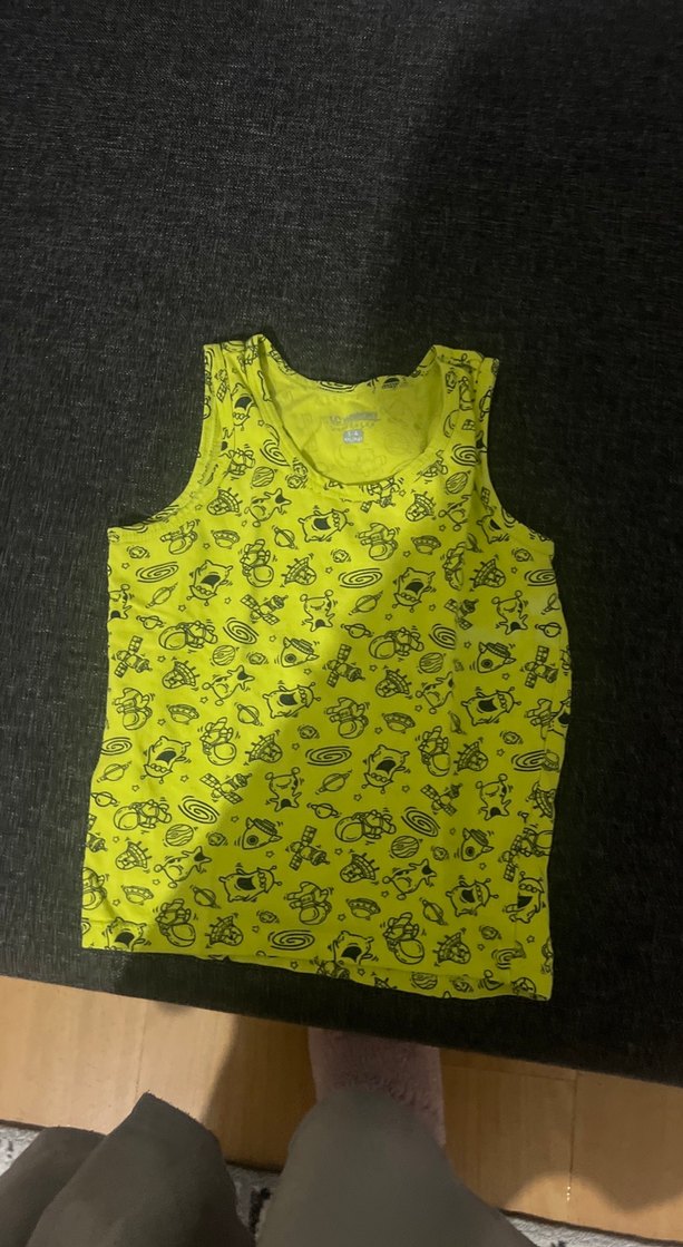 Sarı renkli, renkli baskılı desenlere sahip çocuk atletidir.