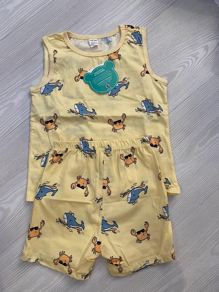 Pastel sarı renkte, yengeç ve köpekbalığı desenli çocuk atlet ve şort takımıdır. Kolsuz üst ve uyumlu şort rahat kullanım sağlar.