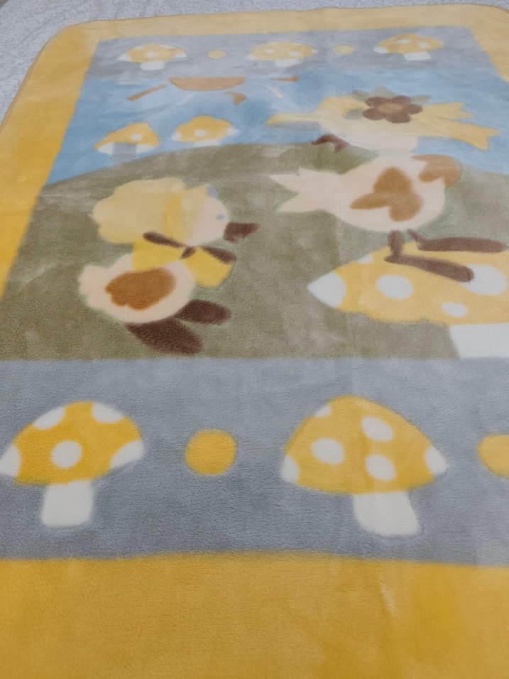 Yumuşak ve sıcak kumaştan yapılmış, pastel sarı tabanlı, hayvan ve mantar desenli çocuk battaniyesi. yumuşacık, az kullanılmış, sıcacık tutan kalın Battaniye. 127cm/99 cm