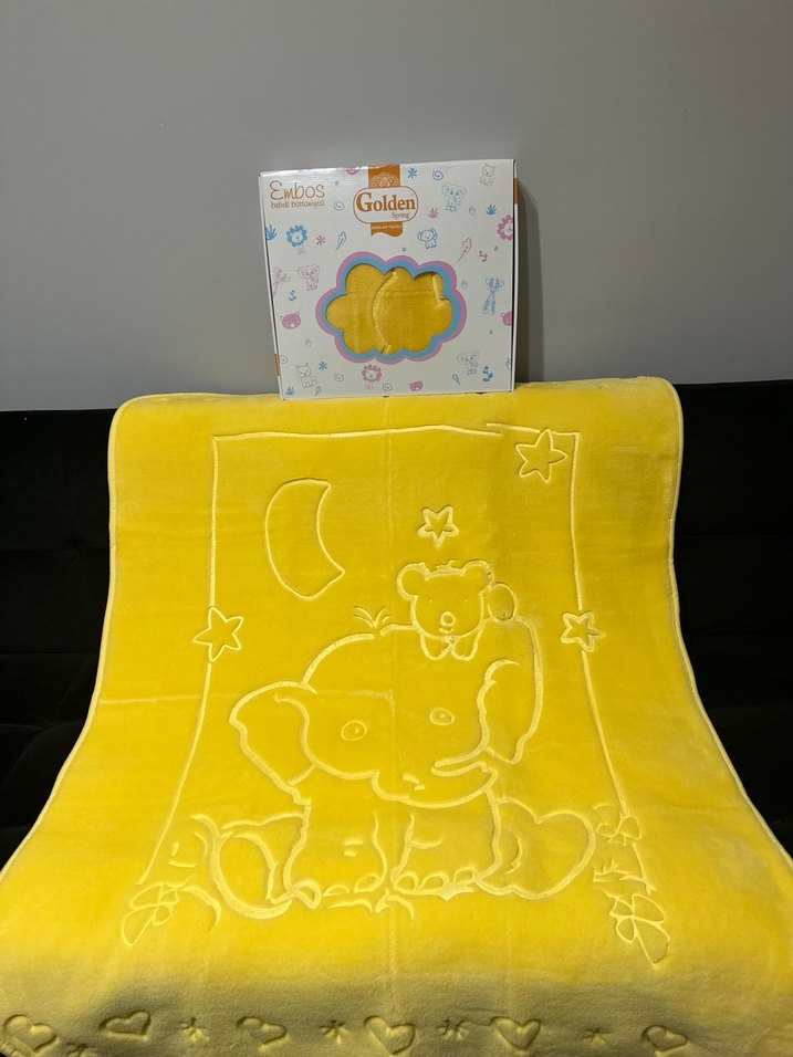 Yumuşak dokulu, renkli sarı çocuk battaniyesi. Fil ve ayıcık desenleri kabartmalı, yıldız ve ay figürlü. Marka: Golden Ürün hiç kullanılmadı sıfır pakettir kutusuyla gönderilecektir
