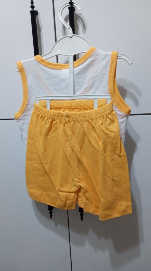 Açık sarı renkli çocuk atleti, sevimli köpek ve pati desenleri ile süslenmiştir. Kolsuz ve sarı kenarlıklıdır. Marka: Senind.