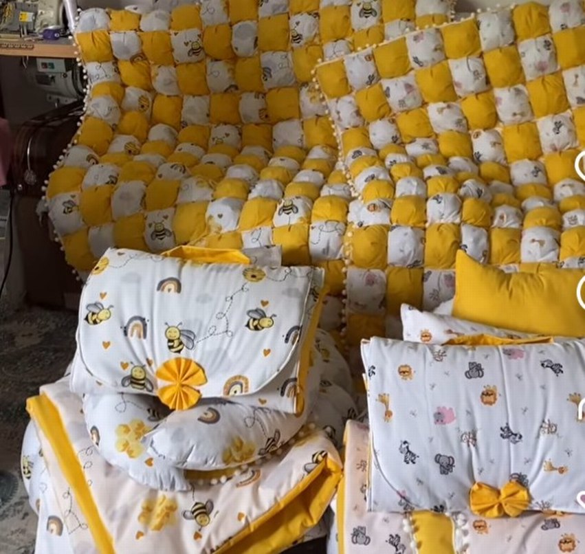 Renkli, yumuşak dolgulu sarı ve beyaz desenli çocuk uyku tekstil seti. Arı ve gökkuşağı motifleriyle çeşitli yastıklı aksesuarlar içerir.