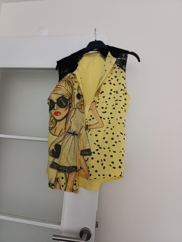 Sarı gömlek, kolsuz tasarıma sahiptir. Desenli, düğmeli kumaştan yapılmıştır, günlük kullanıma uygundur.
