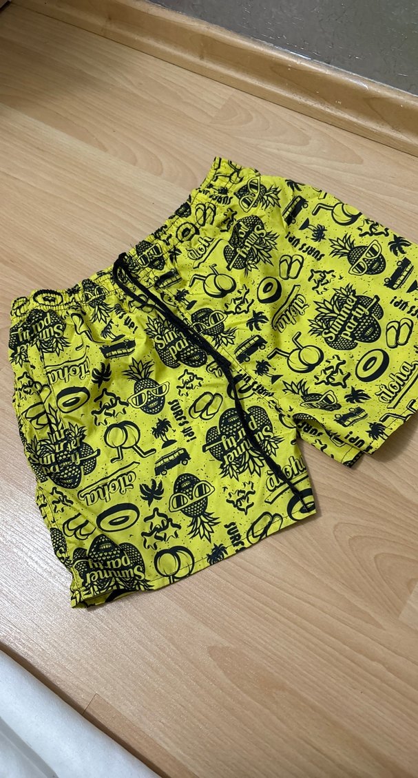 Sarı renkli, renkli yaz temalı desenlere sahip erkek çocuk mayo şortu. Lastikli bel ve bağcık detaylı.