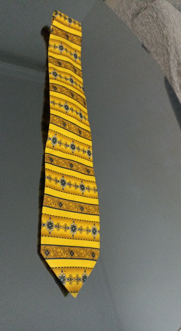 Sarı zemin üzerine desenli şeritlere sahip erkek kravat, renkli ve geleneksel bir görünüm sunar. Bohem tarzına uygun bir aksesuar. marka temsilidir