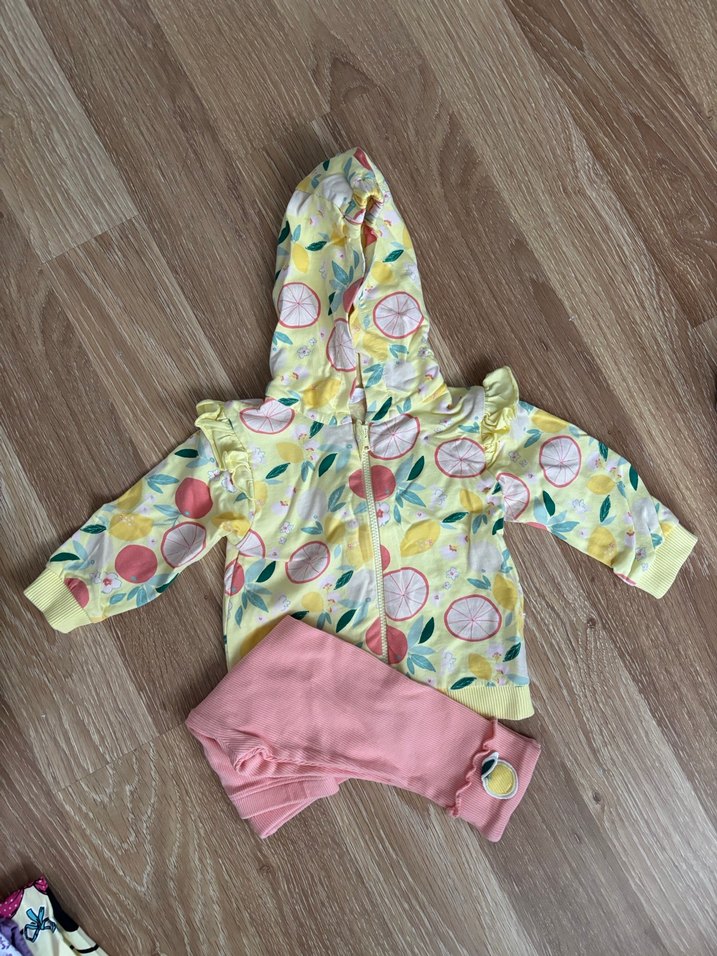 Pastel sarı renkte, meyve desenli, uzun kollu ve fırfırlı üst ile yumuşak pembe pantolondan oluşan bebek kız takımı.
