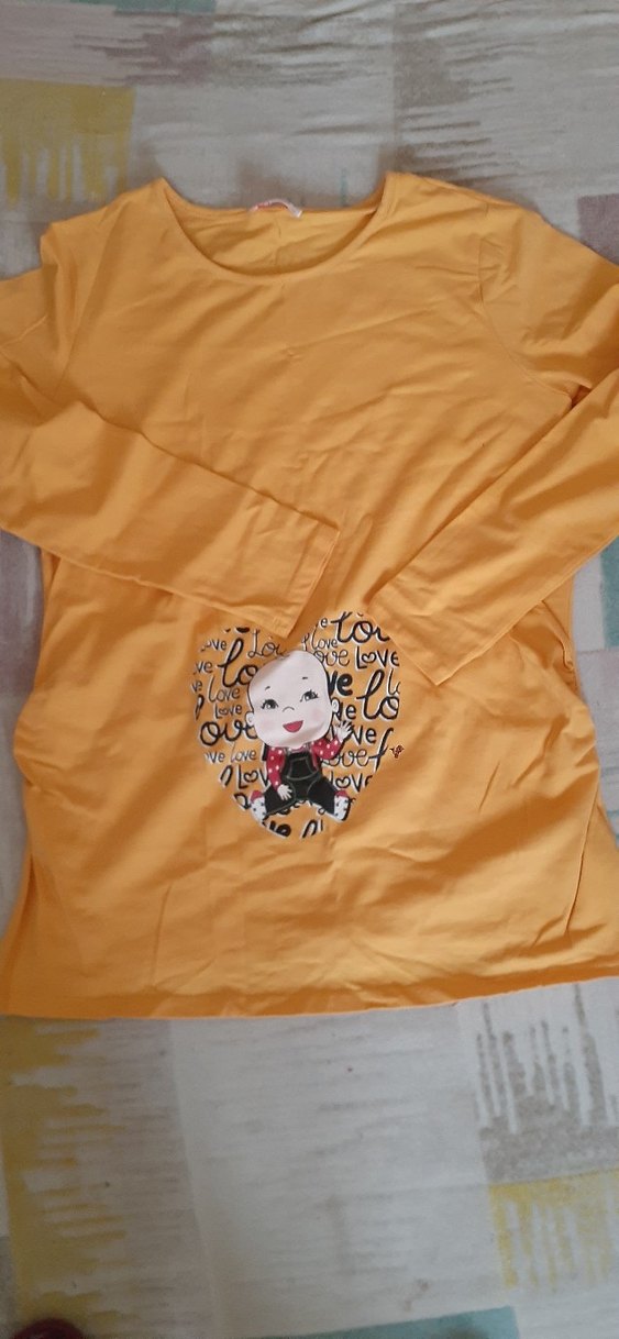 Sarı renkte, uzun kollu ve yuvarlak yakalı hamile bluzu. Yumuşak sentetik kumaştan, bol kesim ve renkli baskılı, sevimli bebek figürlü tasarım. Günlük kullanıma uygun.