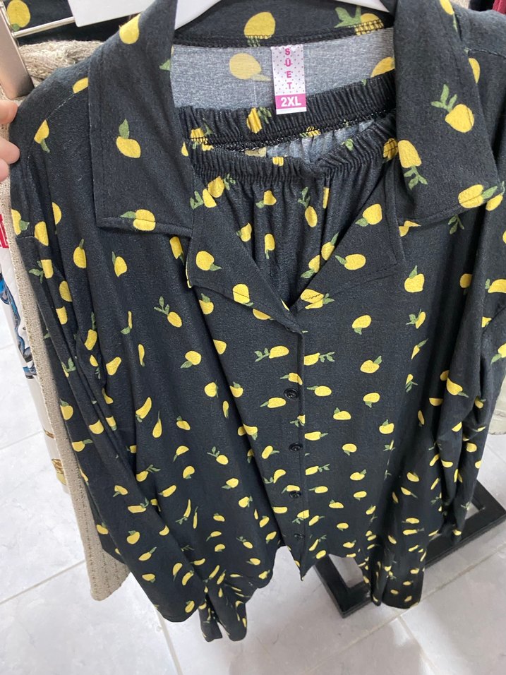 Kadınlar için bol kesim, uzun kollu ve midi boyda pijama takımı. Koyu zemin üzerine sarı desenlerle rahat ve günlük kullanıma uygun.m l xl Xxl vardır