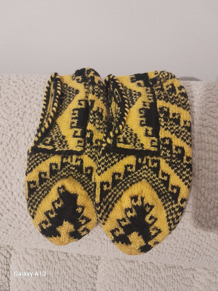 Sarı ve siyah desenli örgü malzemeden yapılmış kadın için sıcak ev terlikleri, bohem ve retro tarzda klasik tasarıma sahiptir.