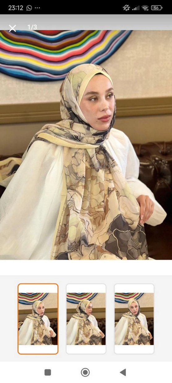 Hafif bej renkli, çiçek desenli, dökümlü kadın şalı. Yumuşak sentetik kumaştan, mütevazı ve bohem stile uygun.
