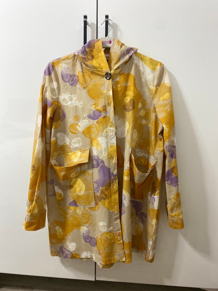 Uzun boy, bol kesim kadın yağmurluk, düğmeli ve kesik yaka detaylıdır. İpeksi kumaştan, parlak sarı bağlamalı desenle, uzun kolludur. Sokak stili için uygundur. ️