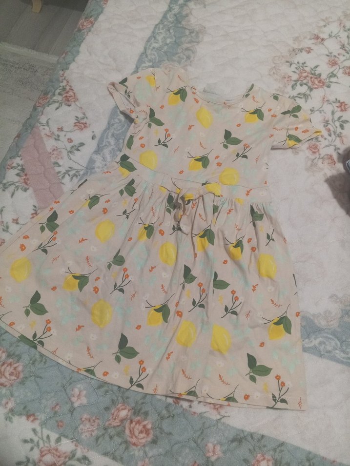 Sarı pastel tonlarında, kısa kollu, bol kesim, fırfır detaylı ve baskılı desenli kız çocuk elbisesi, sentetik kumaştan üretilmiştir.