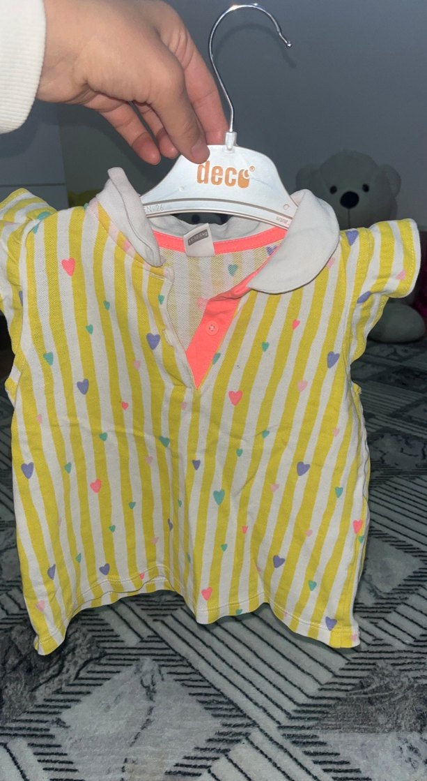 Sarı kısa kollu kız çocuk gömleği, yakalı ve düğmeli. Gevşek kesim, pastel renkli çizgili ve renkli kalp desenli, yumuşak sentetik kumaştan yapılmıştır.