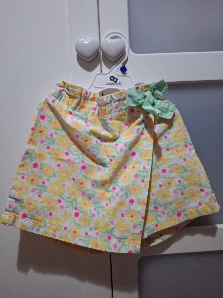 Sarı pastel renkli, bol kesim kız çocuk şort etek, bağlama fiyonk ve çiçek desenleriyle sokak modasına uygun.