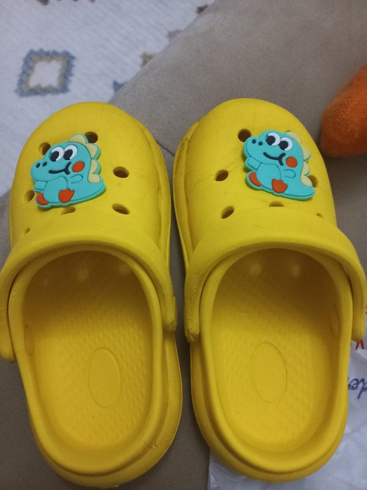 Sarı kauçuk kız çocuk terliği, renkli baskılı desenler ve tokalı detaylarla trend rahat stil için uygun.