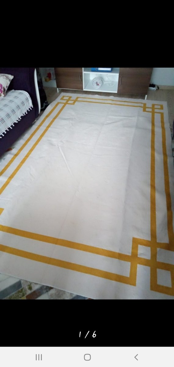 Bu konvansiyonel halı, nötr zemin üzerinde açık sarı geometrik desenler içerir ve mekâna zarif bir dokunuş katar.