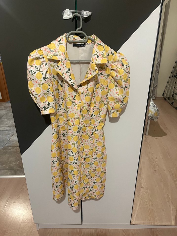 Sarı mini elbise, kısa kabarık kollu, yakalı ve düğmeli önüyle, yumuşak sentetik kumaş üzerinde baskılı desene sahip, günlük kullanım için uygun.