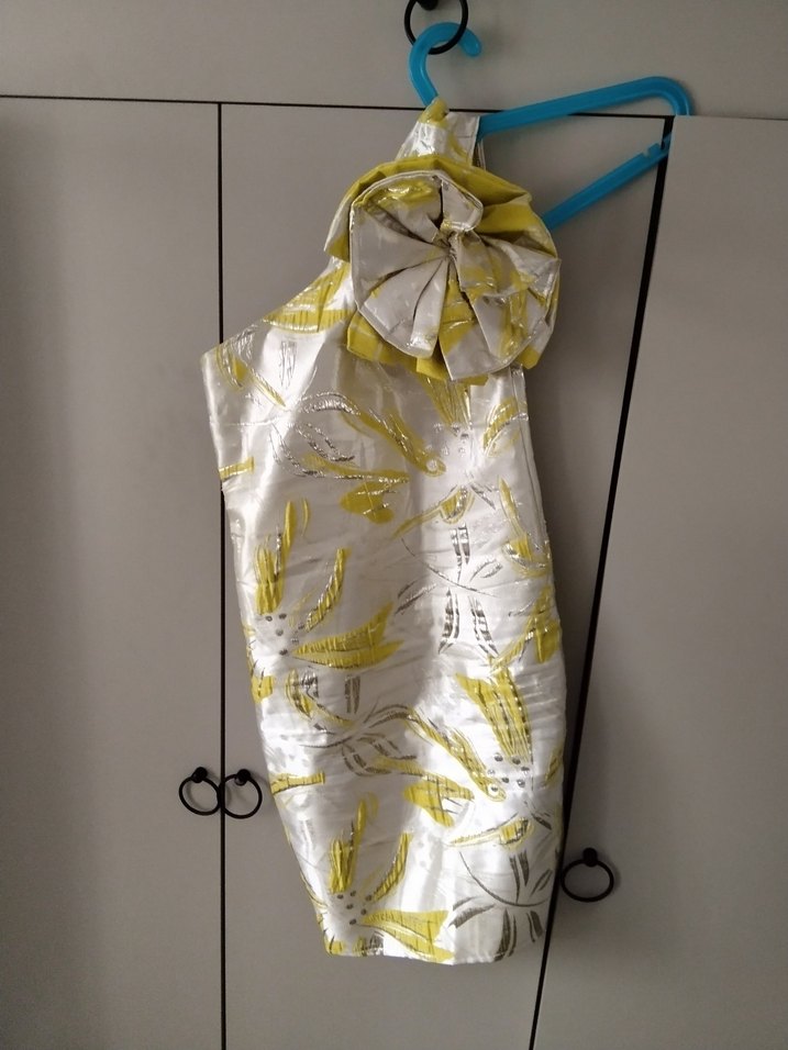 Sarı renkli, desenli ve askısında büyük çiçek detaylı tek omuz mini elbise. Hem şık hem rahattır