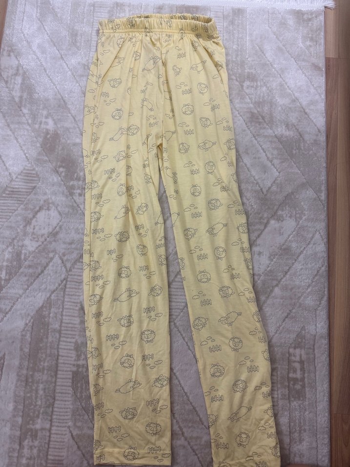 Pastel sarı tonunda, desenli ve normal boyda, rahat kesimli dar kalıp az iç gösteriyor pijama altı