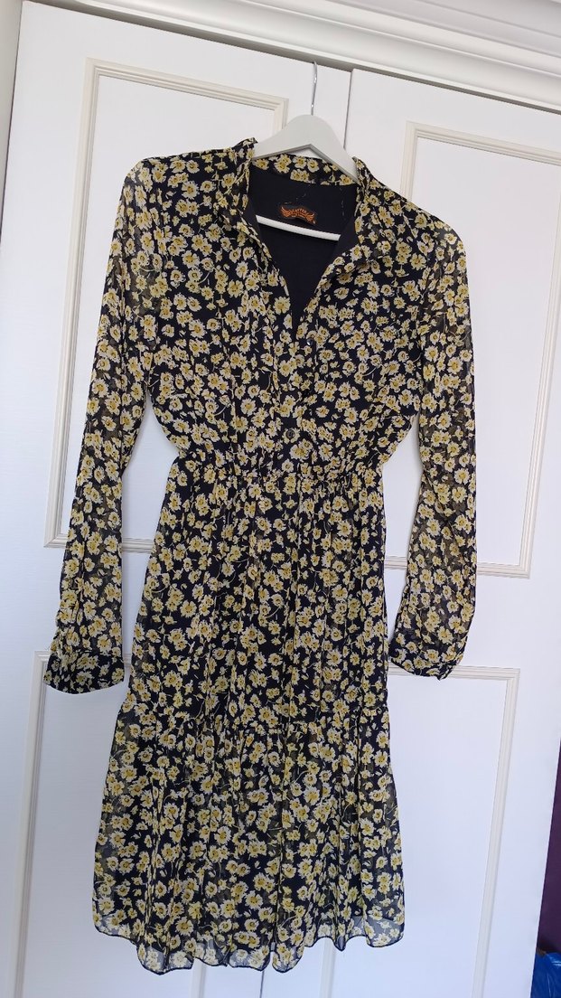 Şifon ve astarlıdır, bel bölgesi lastikli bu yüzden S-M beden uyumludur, lastik bölgesine kadar önden düğmeli. Boyum 1.58 diz üzerinde kalıyor elbise. Giyildiğinde çok hoş duruyor. ister günlük ister özel bir günde tercih edilebilir. ben altına topuklu ile düğünde giymiştim. 1 kez giyildi. yenidir.