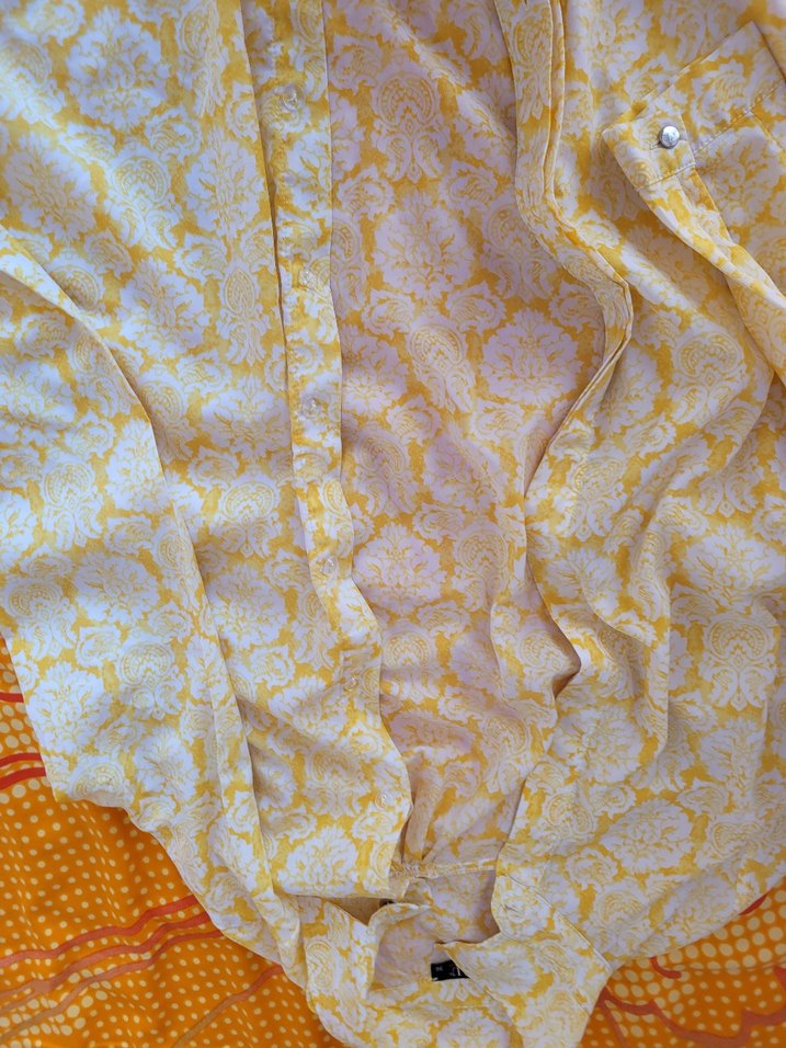 Sarı desenli, uzun ve kollu tunik yakalı ve fırfırlı detaylara sahiptir. Bohem tarzda, günlük kullanıma uygundur.