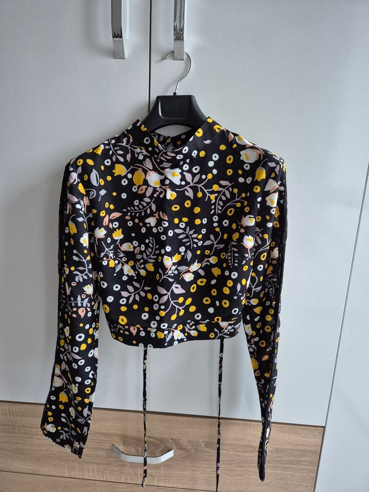 Düğmeli, yüksek yakalı ve uzun kollu, mini kesim kadın bluz. Canlı sarı baskılı, sokak stiline uygun sentetik kumaştan yapılmıştır.