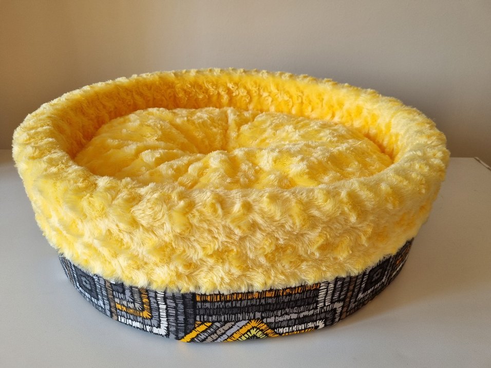 Desenli dış yüzeyi ve yumuşak sarı iç kısmıyla renkli, rahat kedi yatağı.Eni 49 cm, boyu 47 cm, yüksekliği 15 cm.
