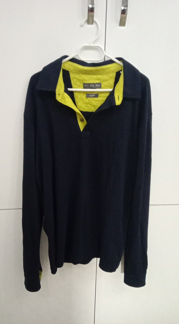 Bu erkek sweatshirtü, polo yaka ve uzun kolludur, bol kesimdir.Koyu lacivert renkte olup iç kısmında canlı sarı detaylar ve düğmeli kapama bulunur, yumuşak ve sıcak kumaştandır.