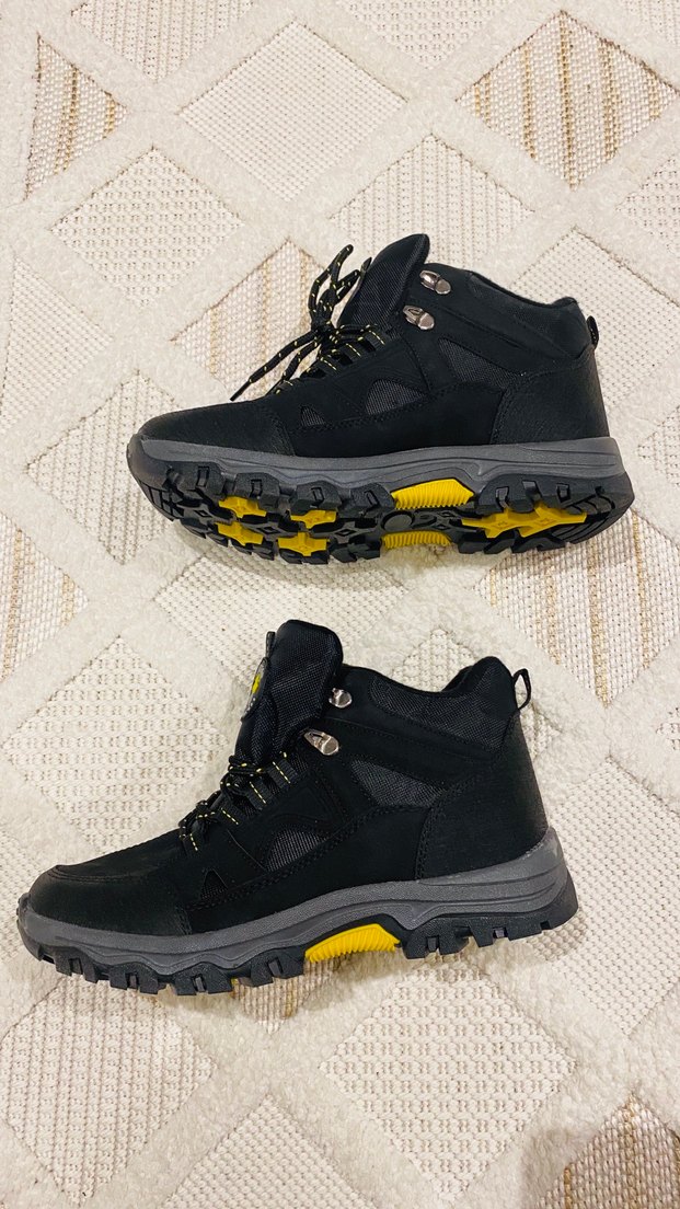 Erkekler için sarı detaylı yılan desenli outdoor bot, bağcıklı ve dayanıklı kauçuk tabanlıdır. 40 numaradır.