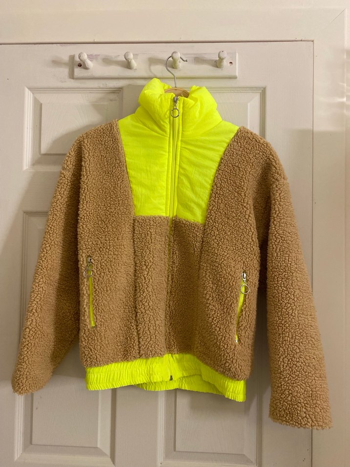 Kadın peluş ceketi, uzun kollu ve yüksek yakalı, normal boyda ve vücuda oturan kesimde. Sarı ve bej tonlarında, yumuşak ve sıcak kumaş, kürk detaylı, fermuarlı cepler ve ön fermuar içerir.