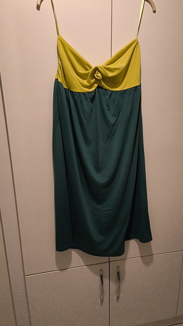 Sarı detaylı, dökümlü üst kısmı ve koyu yeşil penye kumaşı ile midi uzunlukta, bol kesim elbise çağdaş parti stiline uygun.
