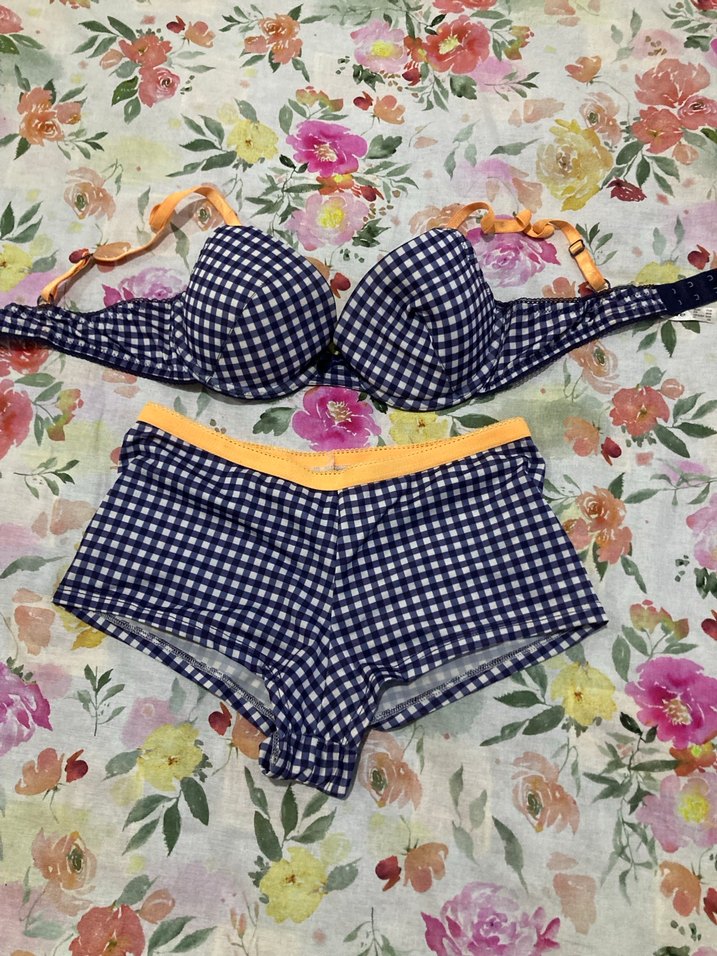 Lacivert beyaz kare desenli sütyen ve alt çamaşır takımı, sarı detaylarla renkli ve mini uzunlukta, Parisli karşı kültür tarzını yansıtıyor.