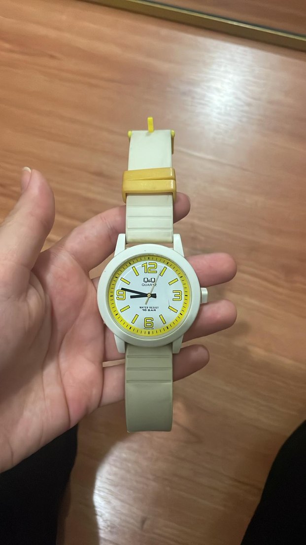 Sarı detaylı, açık renk kayışlı, sade ve minimalist tarzda kadın kol saati. Kayış tokalı ve okunabilir rakamlar bulunur. ⌚