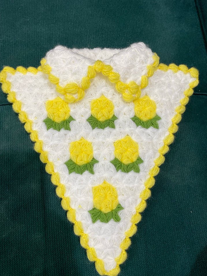 Beyaz taban üzerine sarı çiçek desenli, üçgen şeklinde örgü banyo lif . Yakalı kenar detayıyla renkli ve dokulu bir tasarıma sahip.