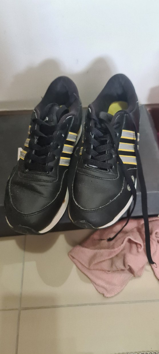 Siyah renkli, koyu sarı çizgili, bağcıklı, kauçuk tabanlı ve ince topuklu kadın spor ayakkabısı. ufak bir açılma var ekledim yapıştırılmasi lazim